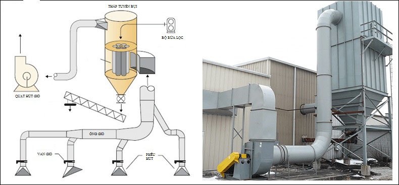 - Hệ thống hút bụi bao gồm: quạt hút bụi, lõi lọc hút bụi, thiết bị rung rũ bụi, nhánh ống gió.
